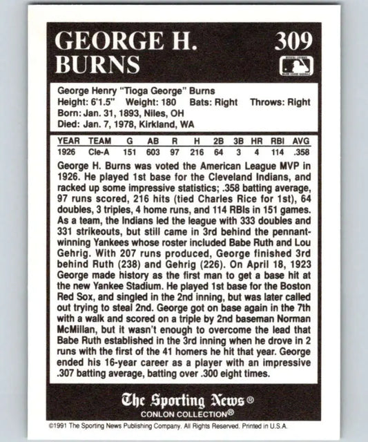 1991 Conlon Collection #309 George Burns EX Excellent Cleveland Indians Baseball Card