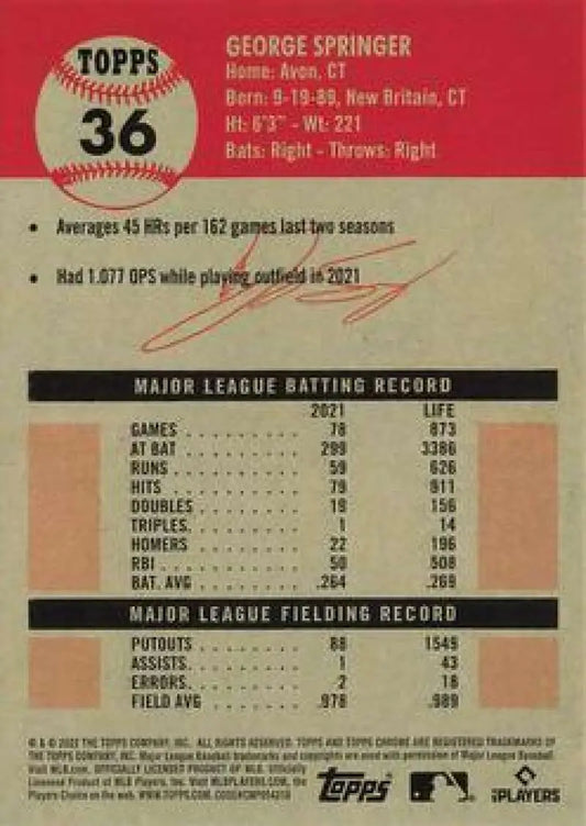 2022 Topps Chrome Platinum Anniversary #36 George Springer NM-MT Toronto Blue Jays Baseball Card