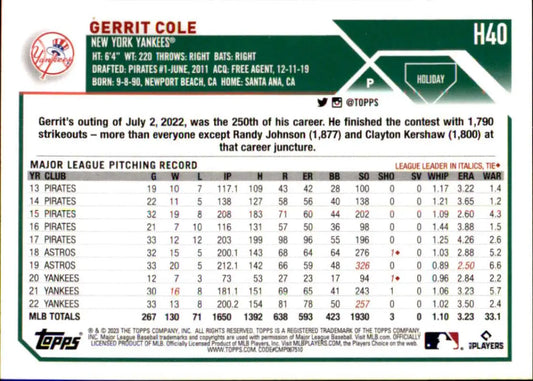 2023 Topps Holiday #H40 Gerrit Cole NM-MT New York Yankees Baseball Card