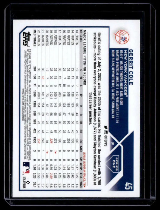 2023 Topps Royal Blue #45 Gerrit Cole NM-MT New York Yankees Baseball Card