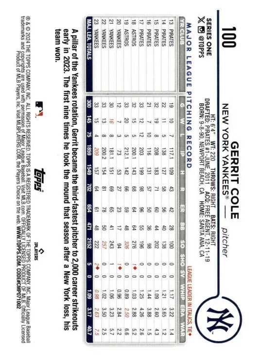 2024 Topps #100 Gerrit Cole NM-MT New York Yankees Baseball Card