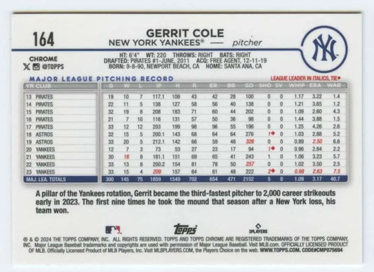 2024 Topps Chrome Refractor RayWave #164 Gerrit Cole NM-MT New York Yankees Baseball Card