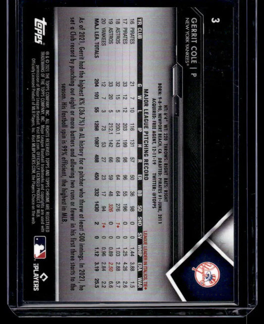 2021 Topps Chrome Black #3 Gerrit Cole NM/MT New York Yankees Baseball Card