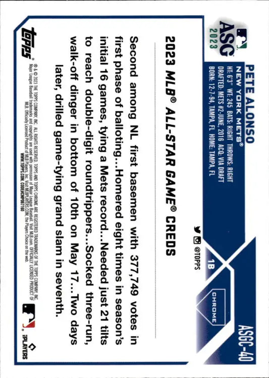 2023 Topps Chrome Update All-Star Game Refractor #ASGC-40 Pete Alonso NM-MT New York Mets Baseball Card
