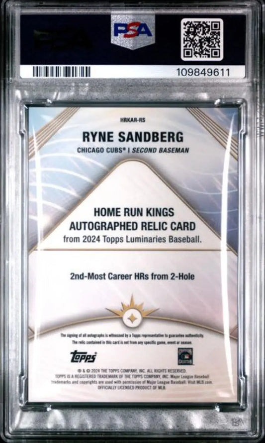 2024 Topps Luminaries #HRKARRS Ryne Sandberg PSA 10 GEM MINT MEM Auto 13/25 Chicago Cubs Baseball Card