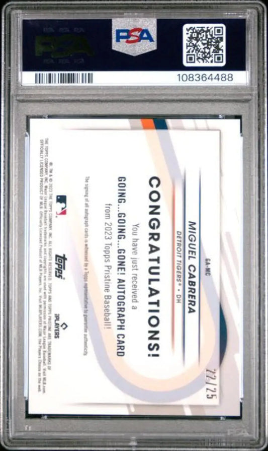 2023 Topps Pristine Going Going Gone Refractor Orange #GA-MC Miguel Cabrera PSA 10 GEM MINT Auto 22/25 Detroit Tigers