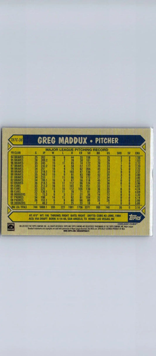 2022 Topps Update Greg Maddux 1987 Topps Baseball 35th Anniversary Chrome