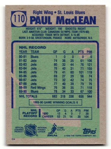 1990 Topps #110 Paul MacLean St. Louis Blues Hockey Cards NM Near Mi ID:55531