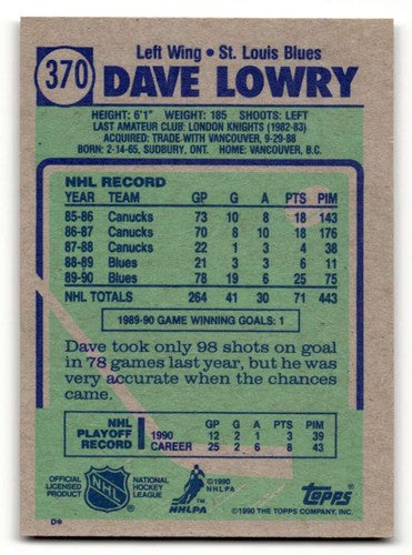1990 Topps #370 Dave Lowry St. Louis Blues Hockey Cards NM Near Mint ID:55532