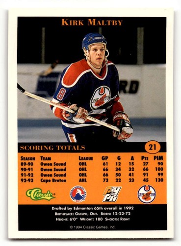 1994 Classic Pro Prospects #21 Kirk Maltby Cape Breton Oilers Hockey ID:55494