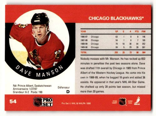 1990 Pro Set #54a Dave Manson Chicago Blackhawks Hockey Cards EX/NM ID:60540