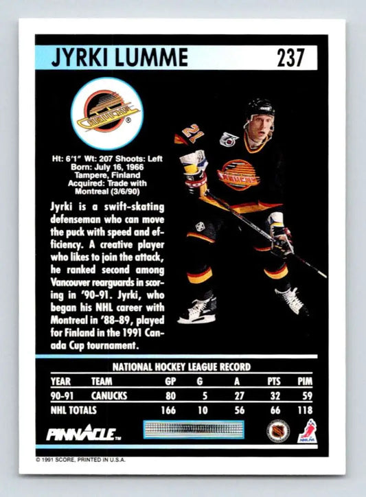 1991-92 Pinnacle #237 Jyrki Lumme NM-MT Vancouver Canucks Hockey Card