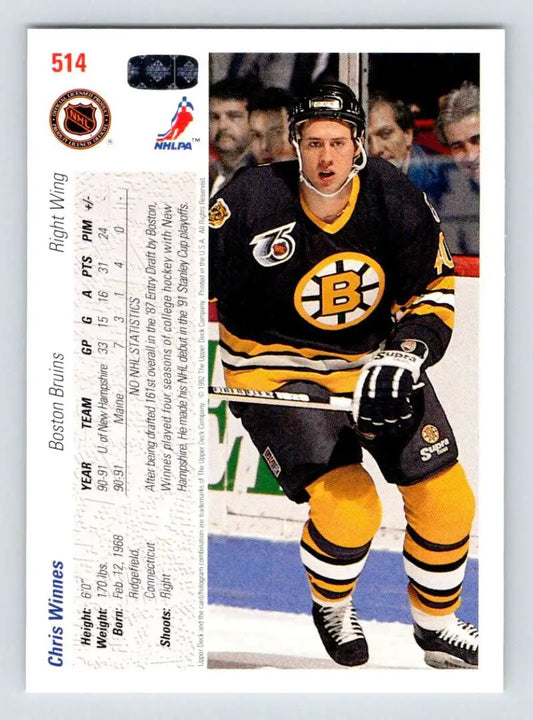 1991-92 Upper Deck #514 Chris Winnes NM-MT RC Rookie Boston Bruins Hockey Card