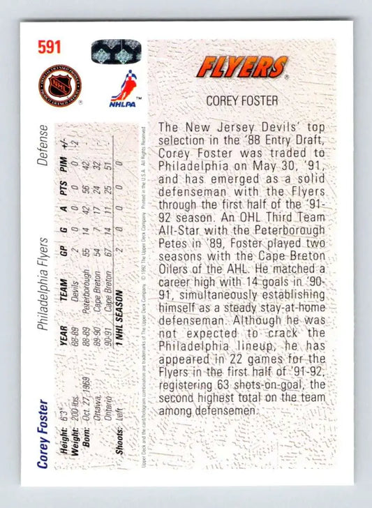 1991-92 Upper Deck #591 Corey Foster NM-MT RC Rookie Philadelphia Flyers Hockey Card