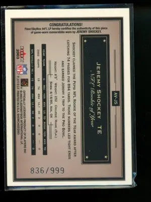 2003 Fleer Showcase Jeremy Shockey #AV-JS Game-Worn Jersey Football