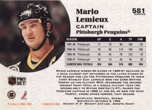 1991-92 Pro Set #581 Mario Lemieux NM-MT Pittsburgh Penguins Hockey Card