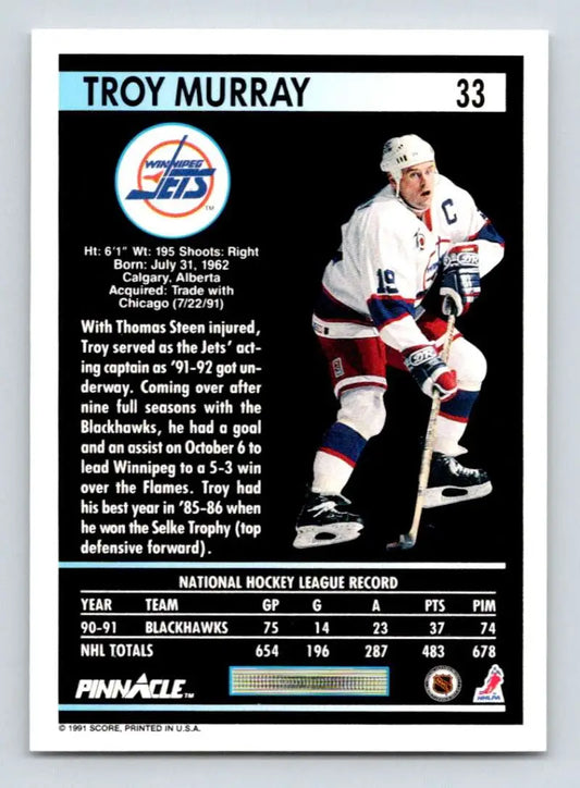 1991-92 Pinnacle #33 Troy Murray NM-MT Winnipeg Jets Hockey Card