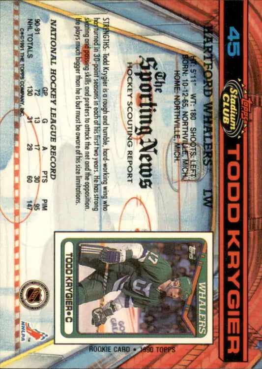 1991-92 Topps Stadium Club #45 Todd Krygier NM-MT Hartford Whalers Hockey Card