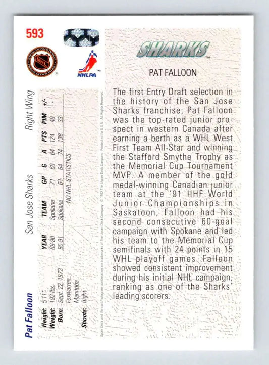 1991-92 Upper Deck #593 Pat Falloon NM-MT San Jose Sharks Hockey Card