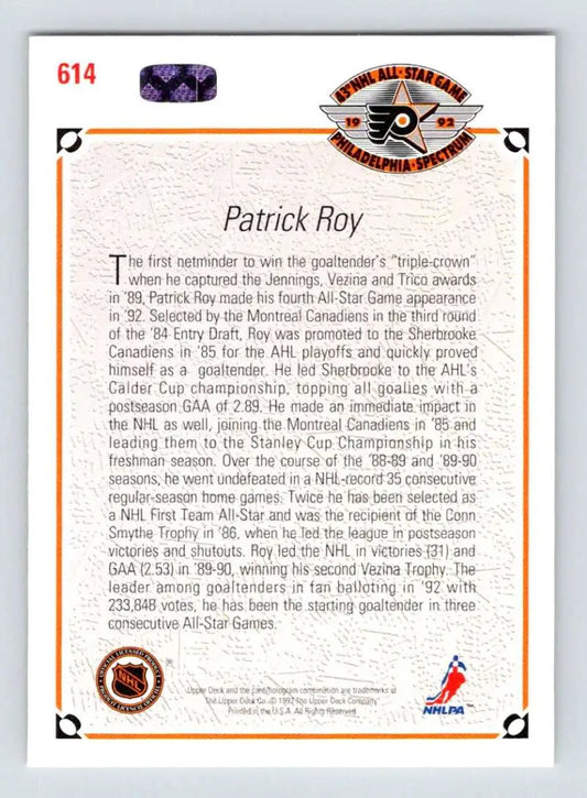 1991-92 Upper Deck #614 Patrick Roy AS NM-MT Montreal Canadiens Hockey Card