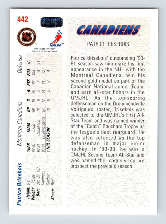 1991-92 Upper Deck #442 Patrice Brisebois NM-MT Montreal Canadiens Hockey Card