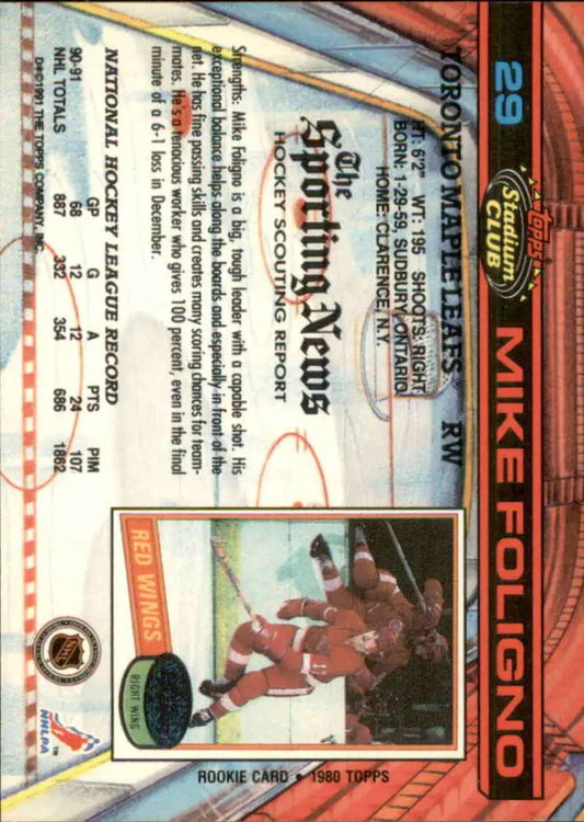 1991-92 Topps Stadium Club #29 Mike Foligno NM-MT Toronto Maple Leafs Hockey Card