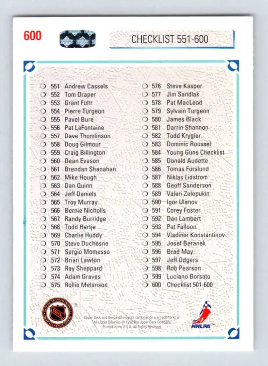 1991-92 Upper Deck #600 Checklist 501-600 NM-MT Hockey Card