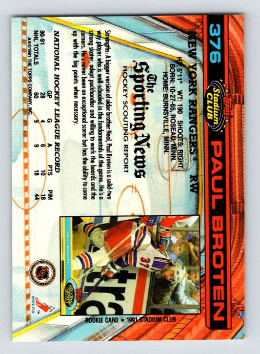 1991-92 Topps Stadium Club #376 Paul Broten NM-MT New York Rangers Hockey Card
