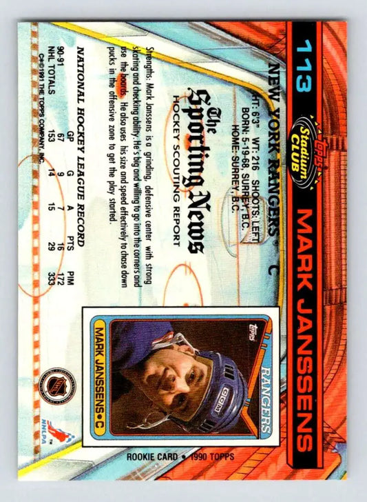 1991-92 Topps Stadium Club #113 Mark Janssens NM-MT New York Rangers Hockey Card