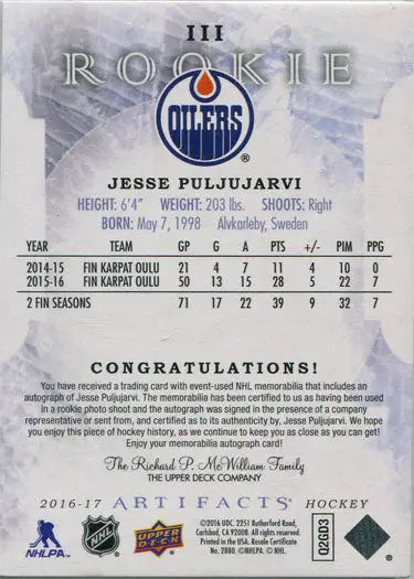 Upper Deck Artifacts Hockey 2016-17 Rookie Auto Patch Card III Jesse Puljujarvi