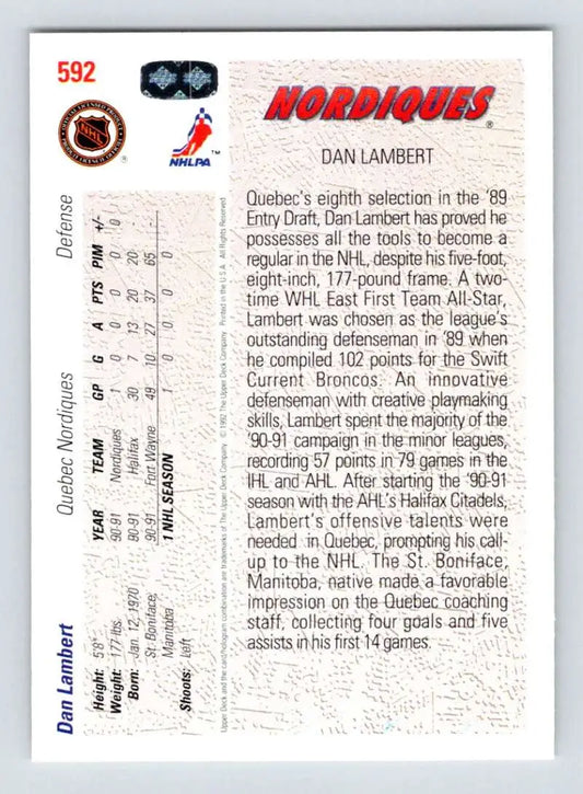 1991-92 Upper Deck #592 Dan Lambert NM-MT RC Rookie Quebec Nordiques Hockey Card