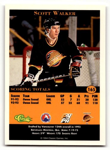 1994 Classic Pro Prospects #165 Scott Walker Hamilton Canucks Hockey ID:55504