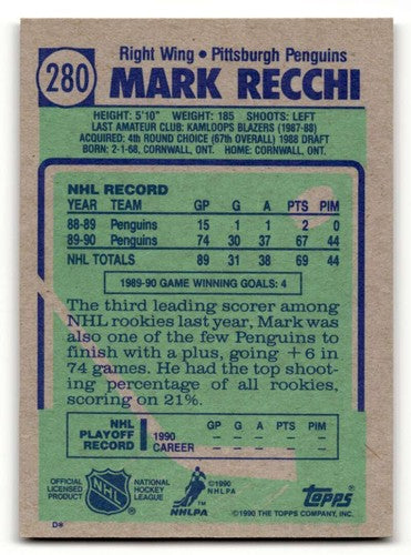 1990 Topps #280 Mark Recchi Pittsburgh Penguins Hockey Cards NM Near ID:55534
