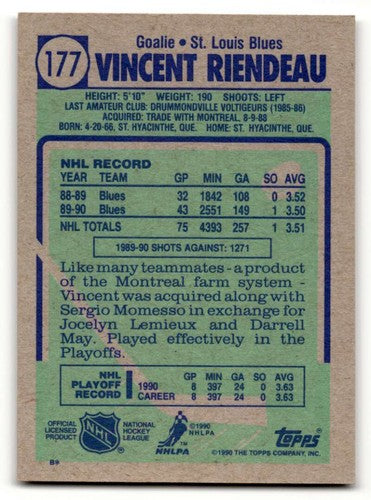 1990 Topps #177 Vincent Riendeau St. Louis Blues Hockey Cards NM Nea ID:55524