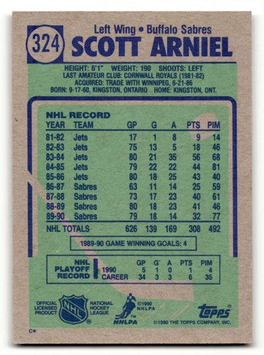 1990 Topps #324 Scott Arniel Buffalo Sabres Hockey Cards NM Near Min ID:55520