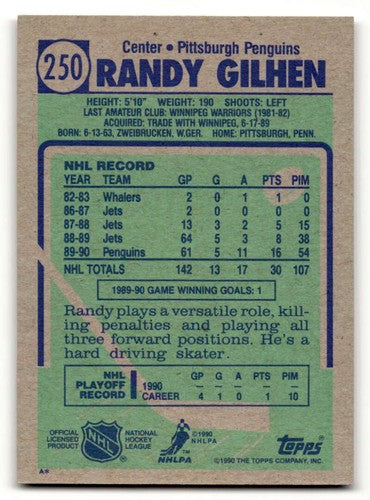 1990 Topps #250 Randy Gilhen Pittsburgh Penguins Hockey Cards NM Nea ID:55535