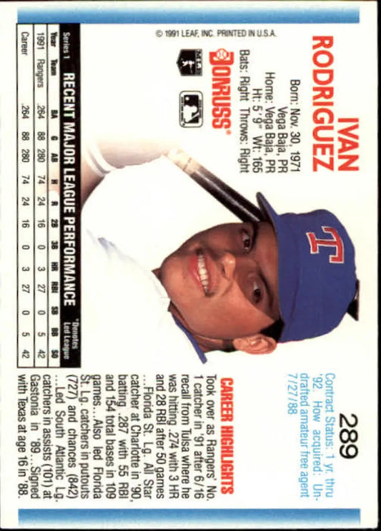 1992 Donruss #289 Ivan Rodriguez NM-MT Texas Rangers Baseball Card