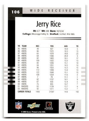 2003 Score Football Jerry Rice #106 Oakland Raiders