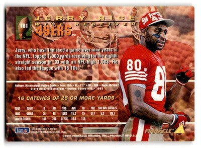 1994 Pinnacle Football Jerry Rice #181 San Francisco 49ers