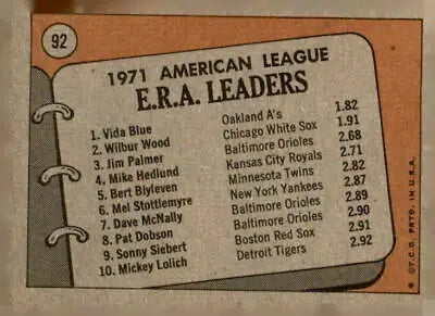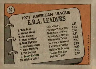 1972 Topps #92 A.L. E.R.A. Leaders (Vida Blue / Wilbur Wood / Jim Palmer) EX-MT