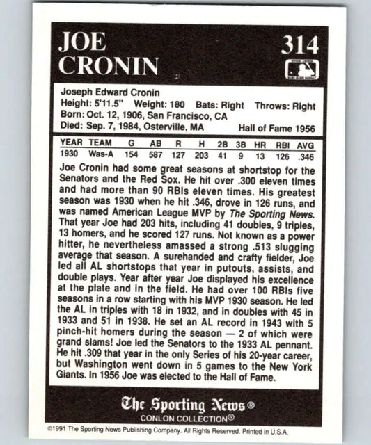 1991 Conlon Collection #314 Joe Cronin EX Excellent Washington Senators Baseball Card