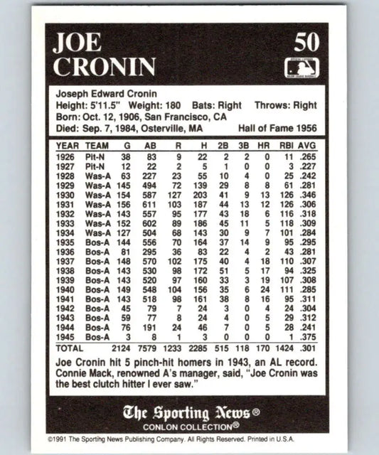 1991 Conlon Collection TSN #50b Joe Cronin "HOF" w/Year Banner on Front ID:52904