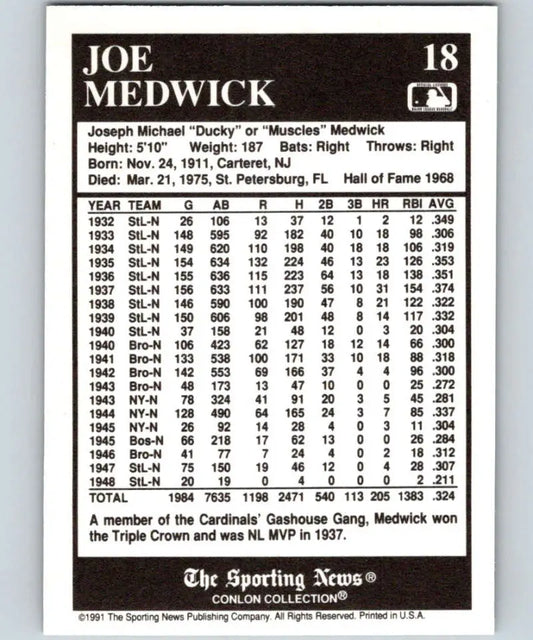 1991 Conlon Collection #18 Joe Medwick EX Excellent St. Louis Cardinals Baseball Card