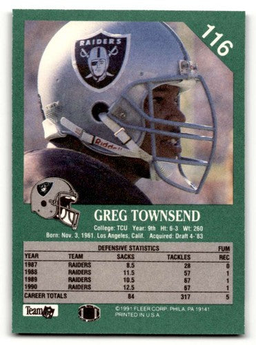 1991 Fleer #116 Greg Townsend Los Angeles Raiders Football Cards NM ID:60512