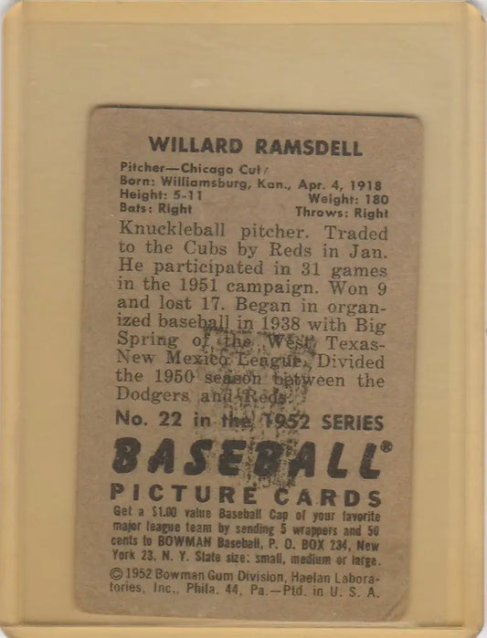 1952 Bowman #22 Willard Ramsdell Chicago Cubs