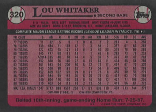 1989 Topps #320 Lou Whitaker NM-MT Detroit Tigers Baseball Card