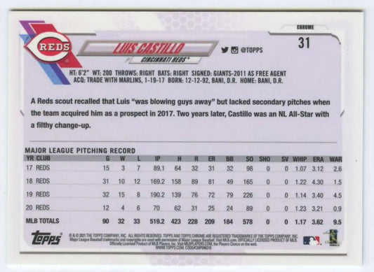 2021 Topps Chrome #31 Luis Castillo NM-MT Cincinnati Reds Baseball Card