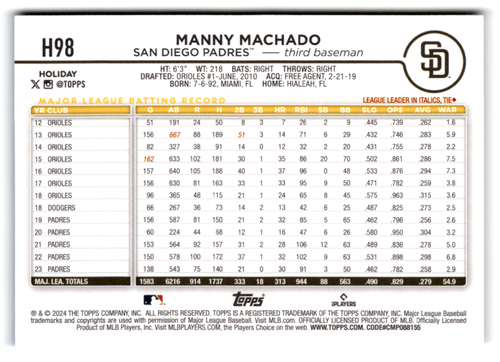 2024 Topps Holiday Image Variation #H98 Manny Machado NM-MT Padres ID:77343