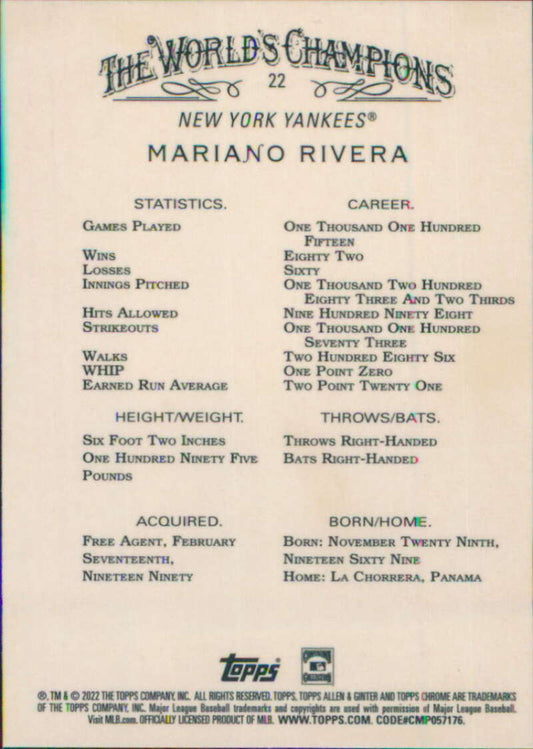 2022 Topps Allen and Ginter Chrome #22 Mariano Rivera NM-MT New York Yankees Baseball Card