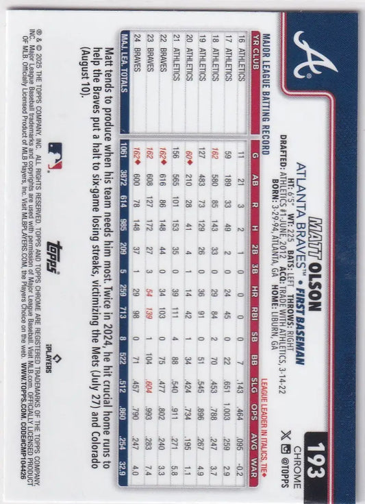 2025 Topps Chrome Baseball Prism #193 Matt Olson - Atlanta Braves